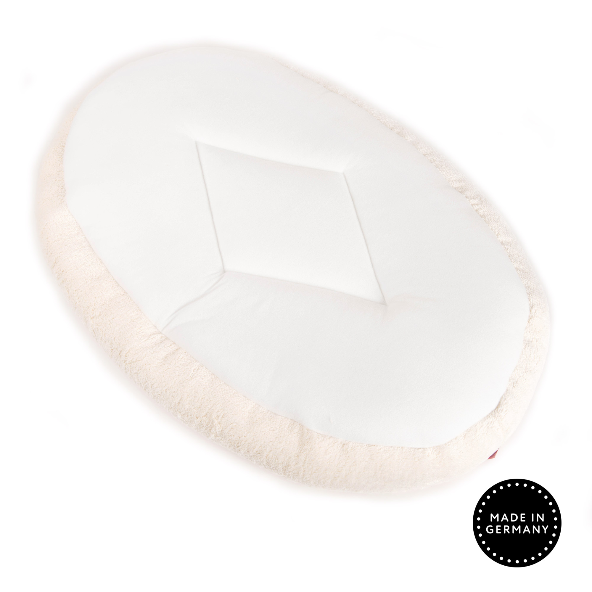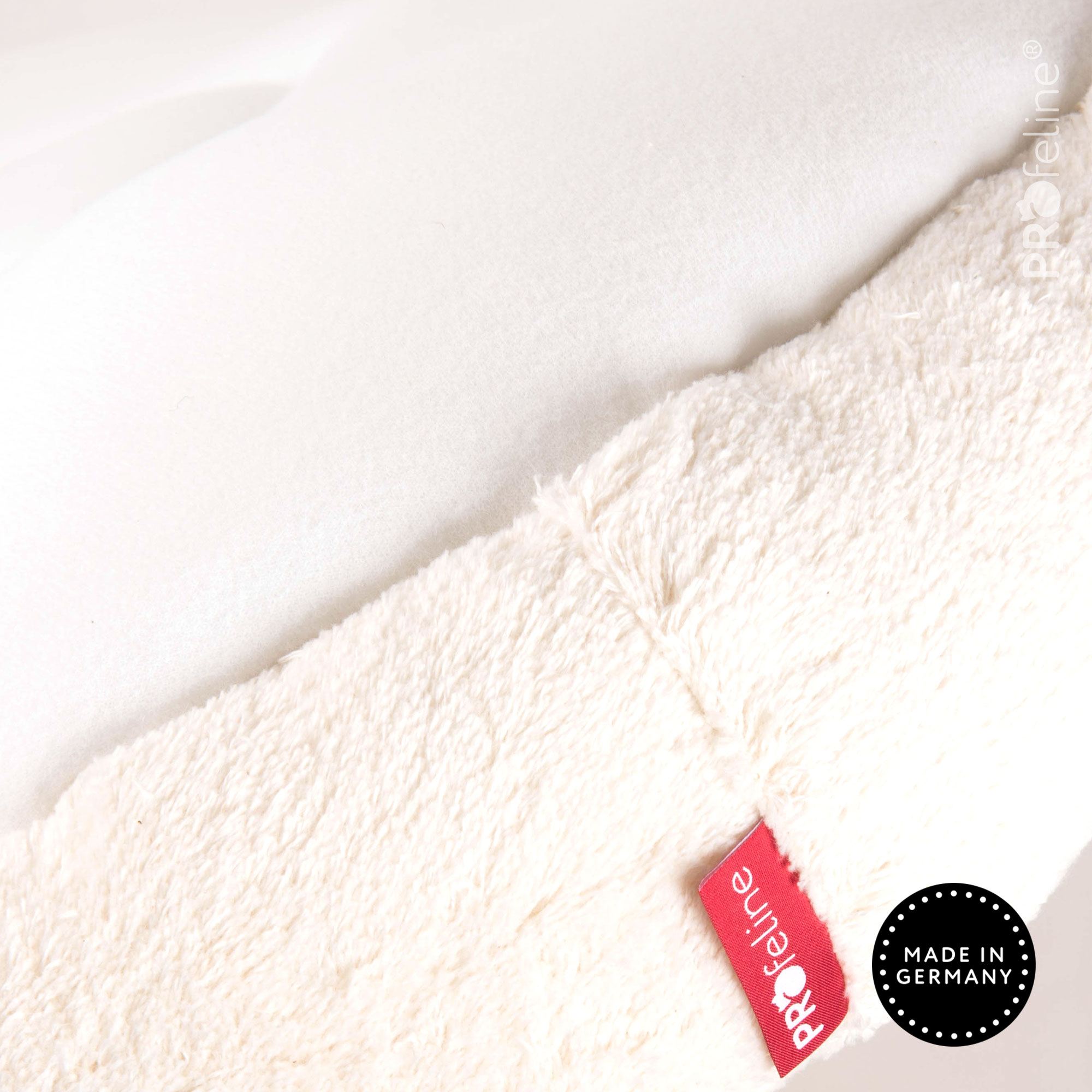 The top of the cat bed is made of of Profeline snuggle-cotton With its woven back and the 8 mm open fibres, is brilliantly aligned with your cat’s requirements. The fabric regulates the temperature and the high cotton content prevents any static charge. Perfect for treading and cuddling in. The Bed is super soft thanks to their hollow fibre silicone filling and they stand up to regular washing and tumble drying.