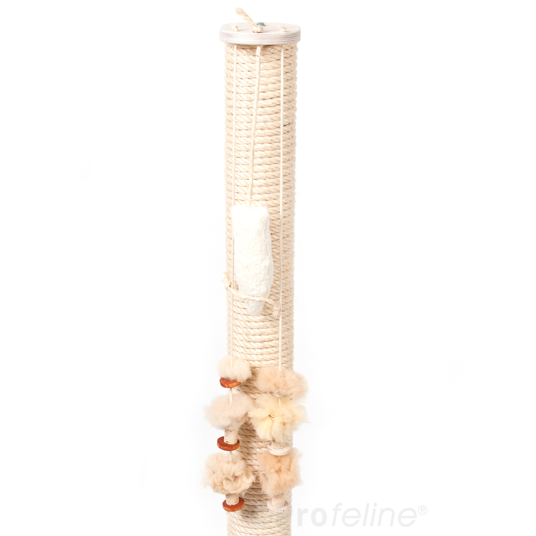 Your cat will love the 3 different natural materials - wood slices for better swings, natural cork for a better catch and fluffy sheepskin with his animating fragrance.