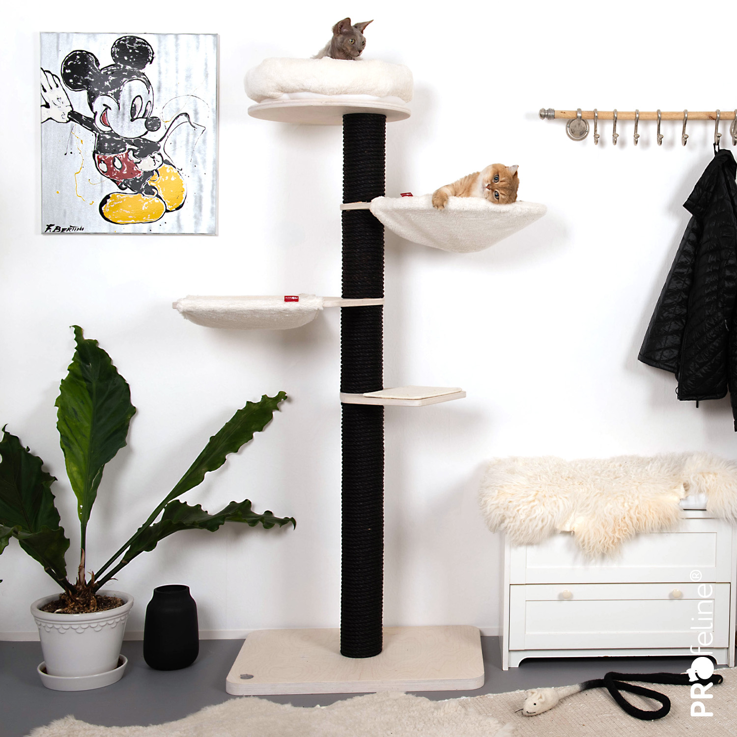 Free-standing scratching posts with base plate GP1 are possible up to a height of 170 cm. This also depends, of course, on the weight of the cat. For extremely heavy cats such as Maine Coons weighing 10 kg or more, a wall bracket WB1 should be planned. It can be added at any later time or expanded with additional posts/platforms.