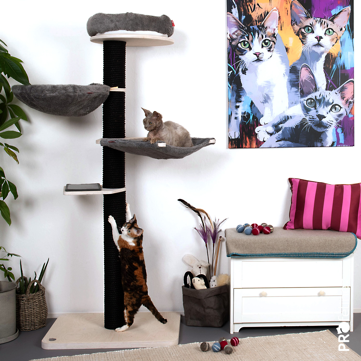 Our modular construction system is showcased in the Lina scratching post with a wide variety of cover and sisal options. Whether with washable, cozy cushions or easy-care carpet covers – our selection menu allows you to configure your desired scratching post easily and place it directly into the shopping cart. Expand, exchange, or complement individual elements at any time – from the post to the platforms and even hammocks. The scratching post can also be visually transformed in no time: thanks to our washable cotton cushions with Velcro fastening, you can create a completely new overall look with just a few simple steps – perfect if your interior style or room concept changes. You can also expand or adjust your scratching post at any later time.